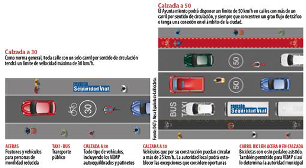 La modificación del Reglamento de Circulación planea modificar la velocidad genérica en las ciudades a 30 km/h. Esto afectará a las vías de un solo carril por sentido de circulación; para el resto de calles, con más de un carril y con una fluidez importante de vehículos, los ayuntamientos podrán mantener la velocidad máxima a 50 km/h.